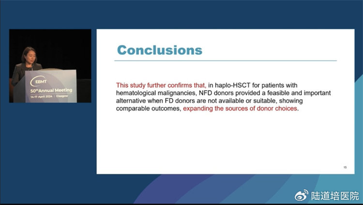 當(dāng)?shù)貢r間,4月16日下午15:15,由陸道培醫(yī)院骨髓移植科胥方醫(yī)生代表盧岳主任團(tuán)隊在“Optimising donor Choice”環(huán)節(jié)中,口頭匯報了“Comparing the Outcomes of Using Non-First-Degree Related Donors to First-Degree Related Donors in Haploidentical HSCT for Hematological Malignancies: A Case-Control Analysis”的臨床研究成果,研究證實了在單倍體造血干細(xì)胞移植中,采用非直系供體在療效及安全性方面均可以與直系供體相媲美,這也為臨床上擴展單倍體移植供者的可選擇范圍提供了進(jìn)一步的證據(jù)支持。盧岳主任團(tuán)隊這一項研究受到了頗多關(guān)注。