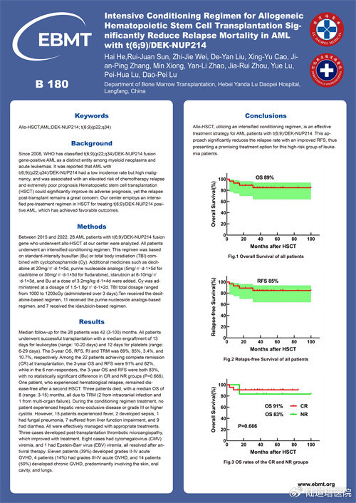 題目:Intensive Conditioning Regimen for Allogeneic Hematopoietic Stem Cell can Overcome the Poor Prognosis of T(6;9)/DEK-NUP214 AML