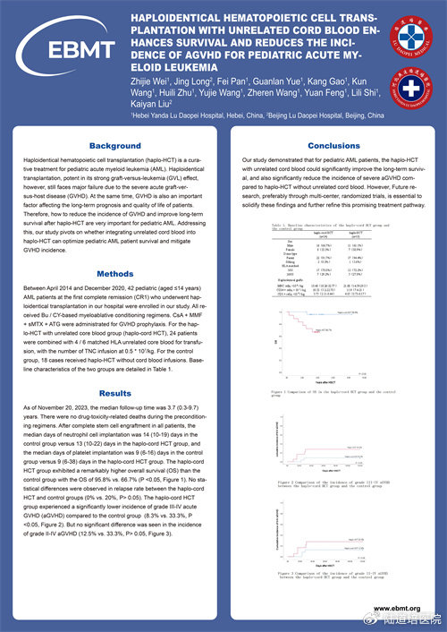 題目:Haploidentical Hematopoietic Cell Transplantation with Unrelated Cord Blood Enhances Survival and Reduces the Incidence of aGVHD for Pediatric Acute Myeloid Leukemia